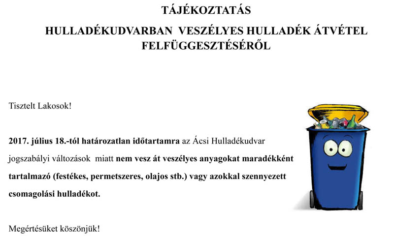 Tájékoztatjuk a tisztelt lakosságot, hogy a polgármesteri hivatal 2017. 07.31. – 2017. 08.14. napja között IGAZGATÁSI SZÜNETET tart, ezért a fenti időtartam alatt az ügyfélfogadás az önkormányzatnál szünetel. Az építési munkálatok miatt a szünet néhány nappal meghosszabbodhat, ezért kérjük figyelje tájékoztatásainkat! Anyakönyvi ügyekben ügyelet minden pénteken 8-12 óra között! |