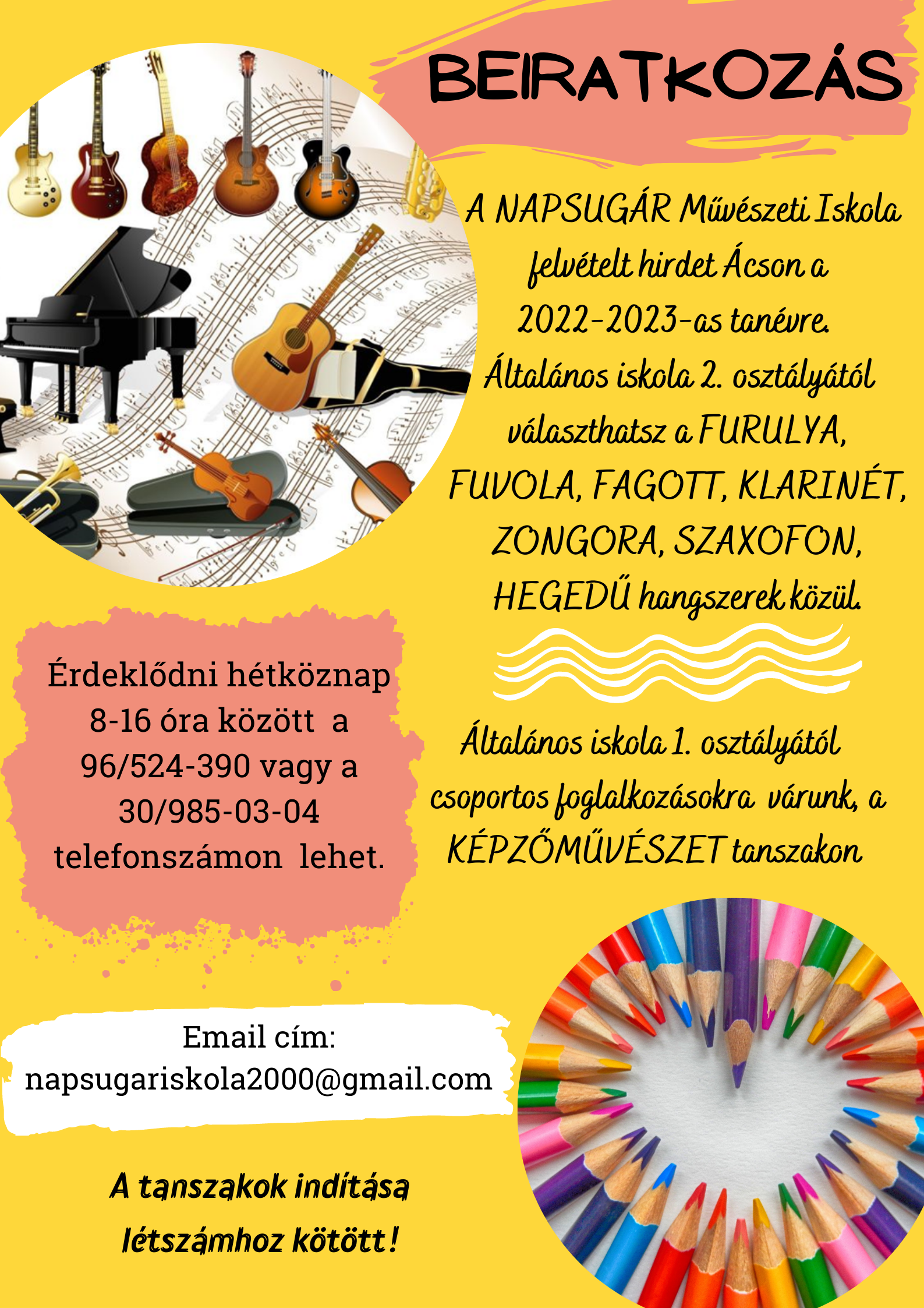 A NAPSUGÁR Művészeti Iskola felvételt hirdet Ácson a 2022-2023-as tanévre